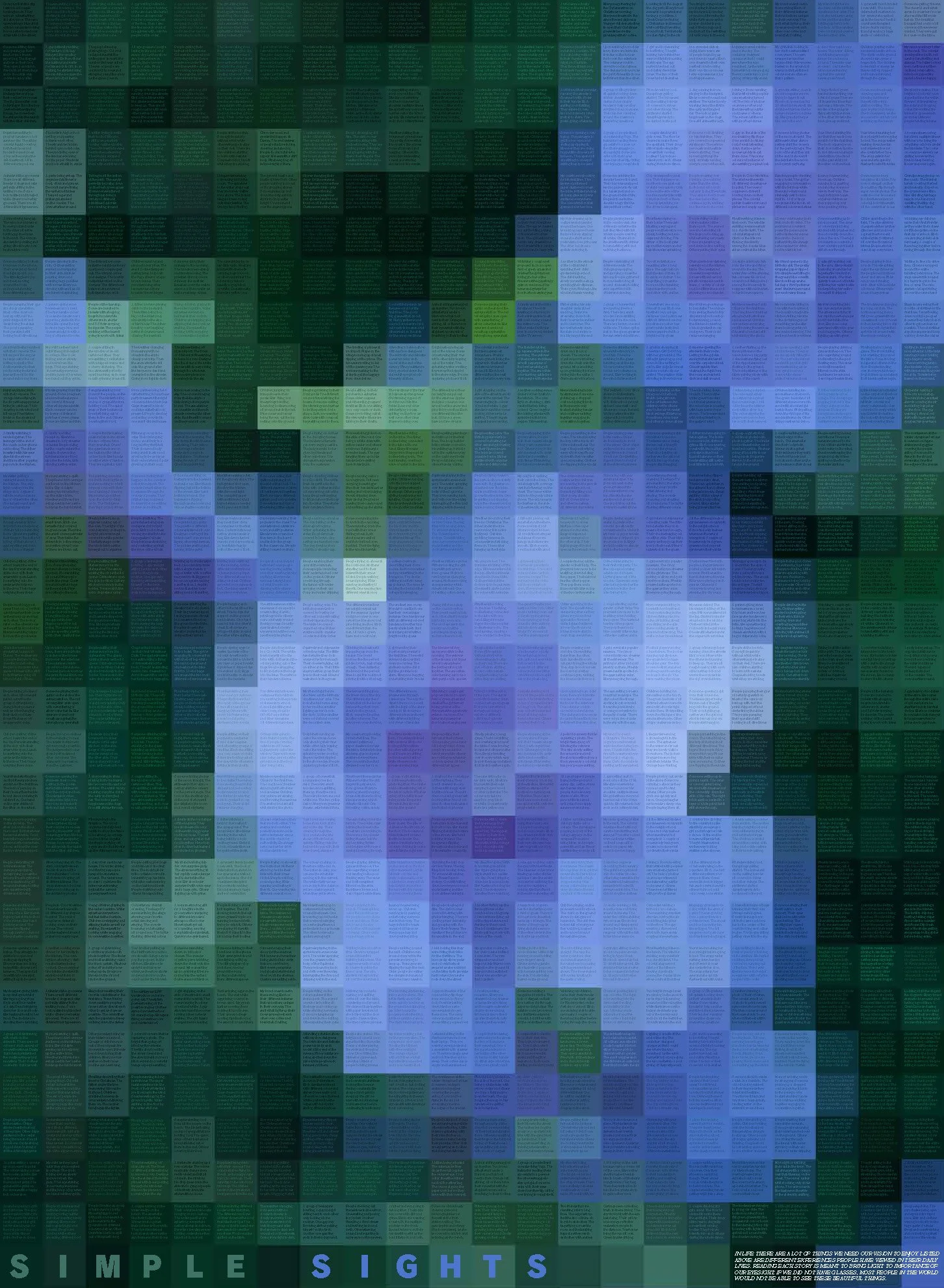 This poster series showcases the tremendous power that eyesight has over everyone. Within each poster, it appears to be a blurry image of a bouquet of flowers, but when viewed more closely is created from pixels that contain thoughts from 638 personal stories. The 638 unique participants were asked to answer one question: “What have you seen today that you appreciated?”. While reading each pixel, viewers are encouraged to reflect upon their own lives and cherish the impact that eyesight has on them.